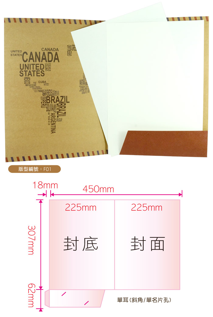| ★A4資料夾完稿注意事項★ ■若需不同刀模,需另加刀模費2000元(特殊形狀價格另計)。 ■4K獨立開版之版型,最大印刷面積520X380mm,費用另計。 ■資料夾完稿出血尺寸沿刀模線往外四邊各加3mm。 ■同時可放入DM及名片,功能性強。 |